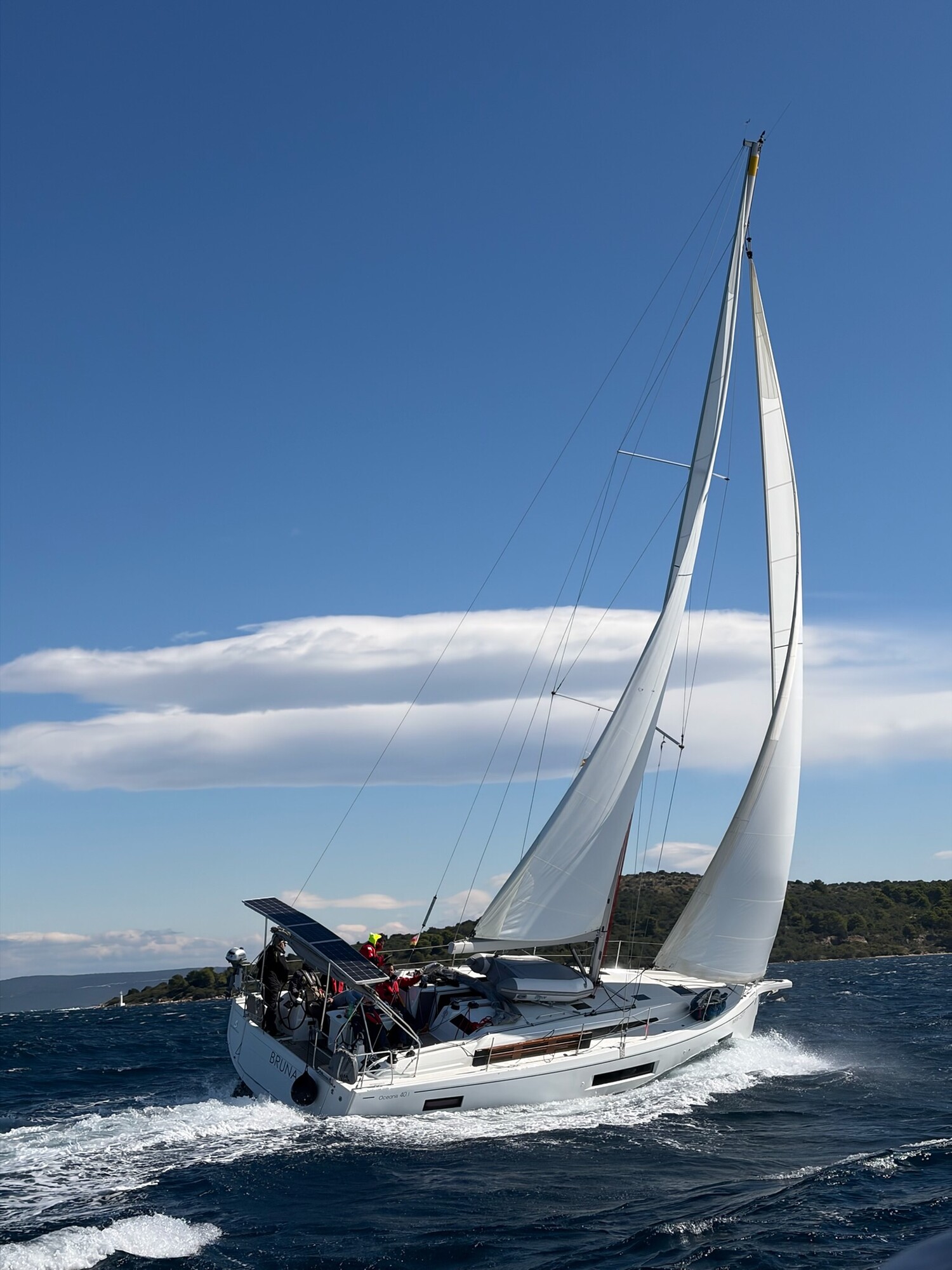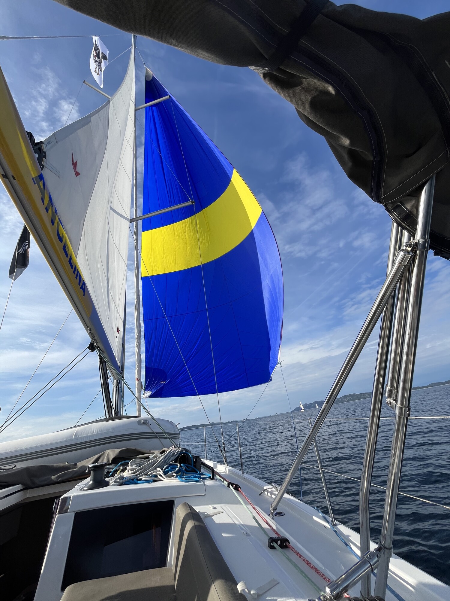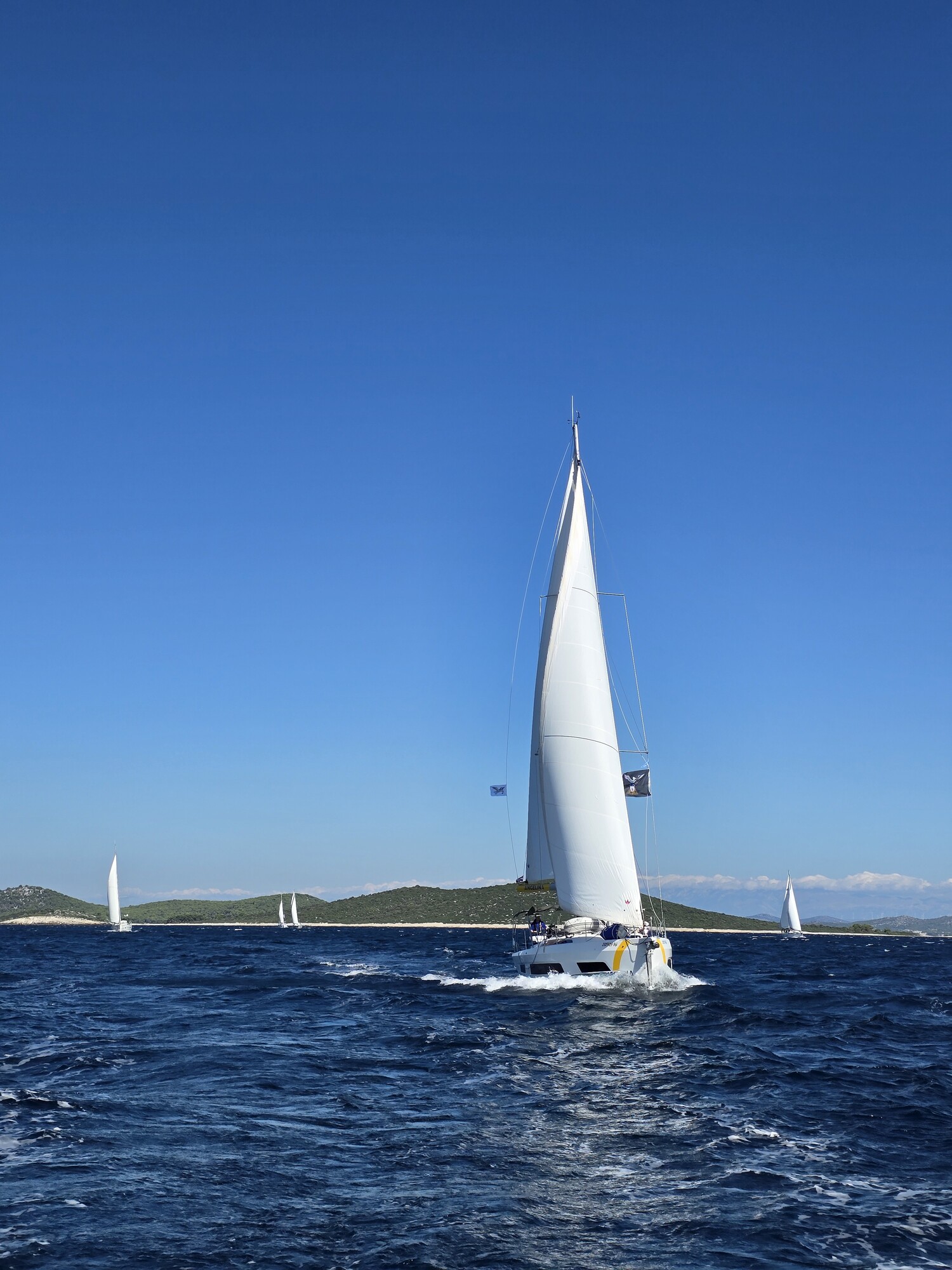 Bei bestem Segelwetter ging es am ersten Tag Richtung Otok Murvenjak. Auf der kurzen Strecke wurde auch direkt eine kleine Kaperfahrt gesegelt. Dabei kam es trotz der eher leichteren Winde zu ersten Kollateralschäden an den Gennakern. Allgemein war die Gennaker-Situation eher durchwachsen. Während manche Crews mit vergleichsweise perfekt auf das Boot zugeschnittenen und bisher vielleicht zwei- oder dreimal gesegelten Gennakern unterwegs war, sah die Lage auf anderen Booten leider etwas anders aus. So waren einige Boote mit Leichtwindsegeln bestückt, die kaum größer als die eigenen Badehandtücher waren und alterstechnisch schon auf den ersten ASK-Flottillen unterwegs gewesen sein könnten.