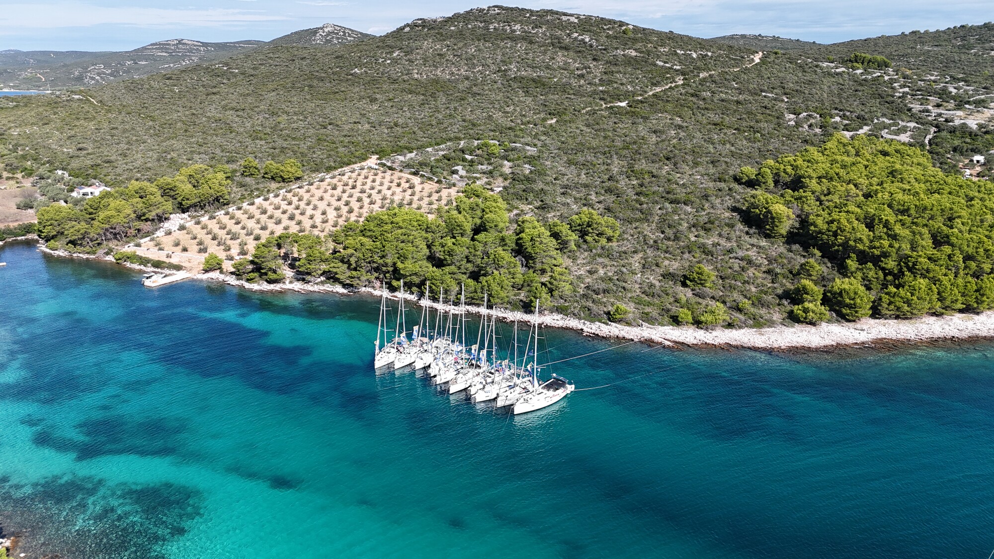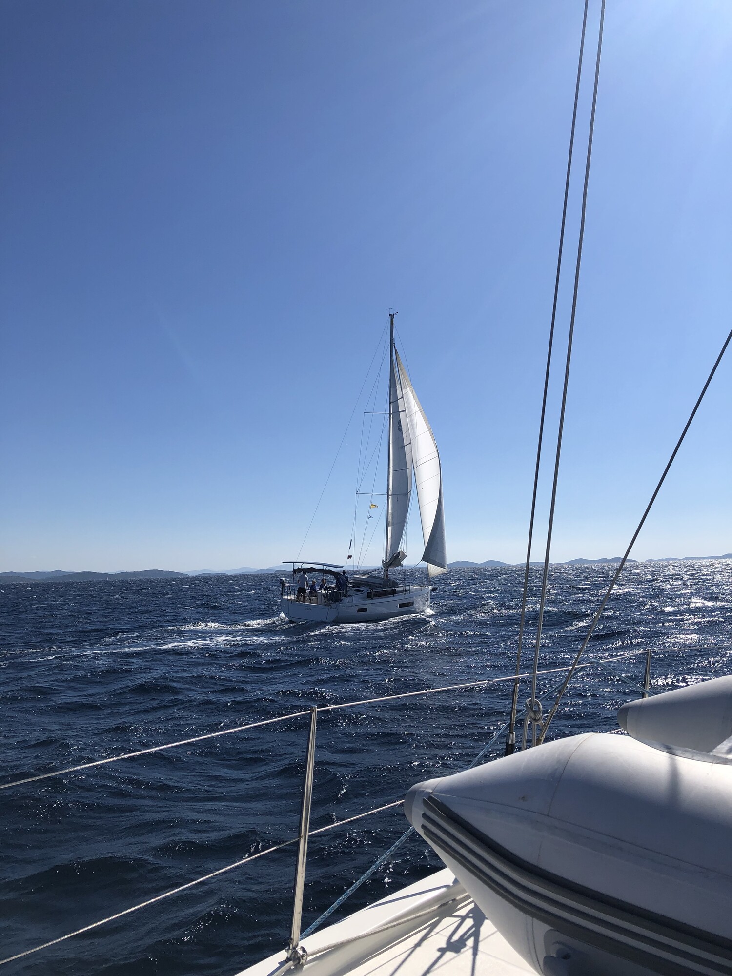 Am folgenden Segeltag stand bei hervorragenden Winden eine sportliche Kaperfahrt auf dem Programm. Die Gennaker konnten an diesem Tag getrost im Sack bleiben, und die Zielbucht Uvala Zincena – ein echter Flottillen-Klassiker in der Region um Biograd – war schnell erreicht. Das Ankern und Päckchenbauen verlief diesmal völlig problemlos – zumindest für uns. Ein weiter außen liegender Landsmann hingegen bekam offenbar panische Angst um seinen mehrere Bootslängen entfernt liegenden Anker und funkte sich meckernd davon, ohne dass wir uns davon aus der Ruhe bringen ließen.