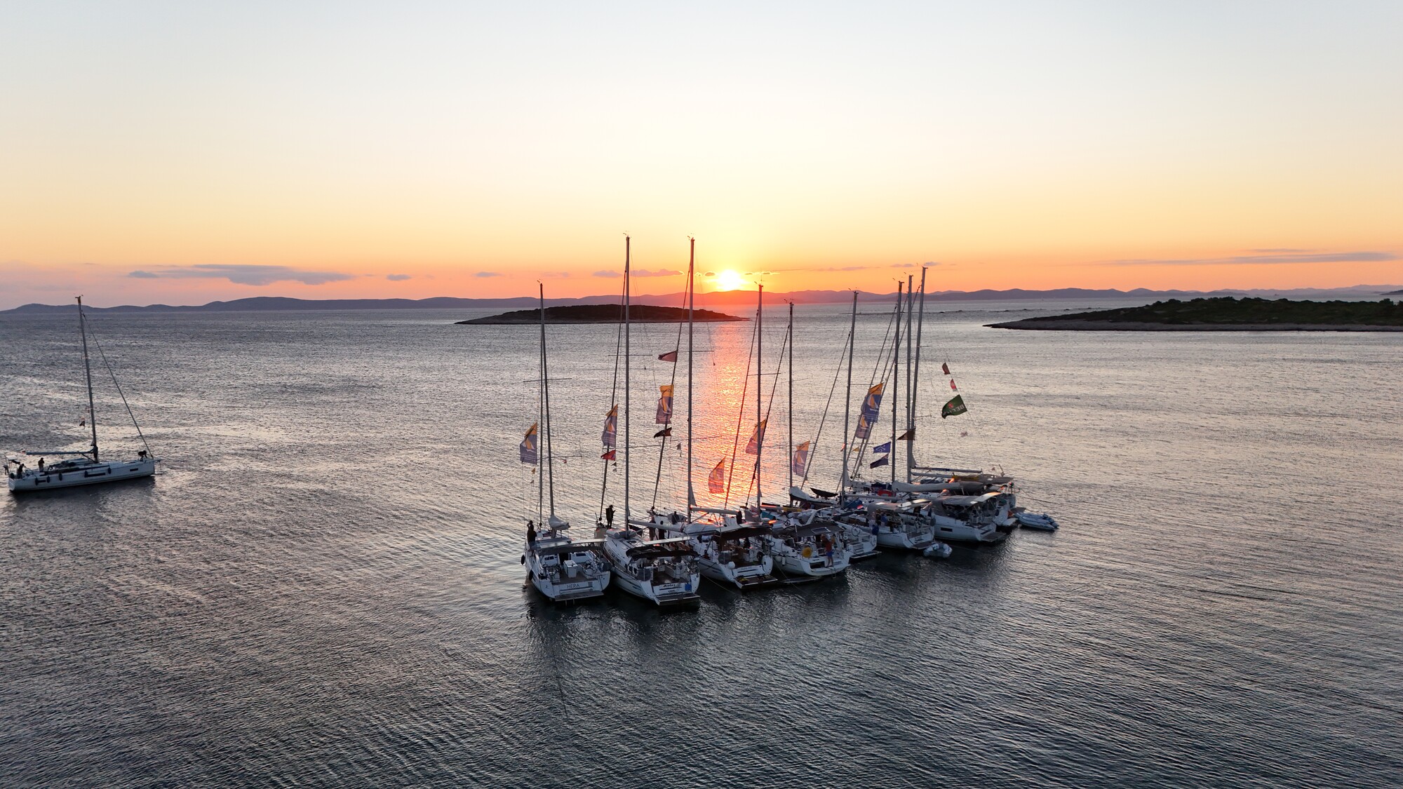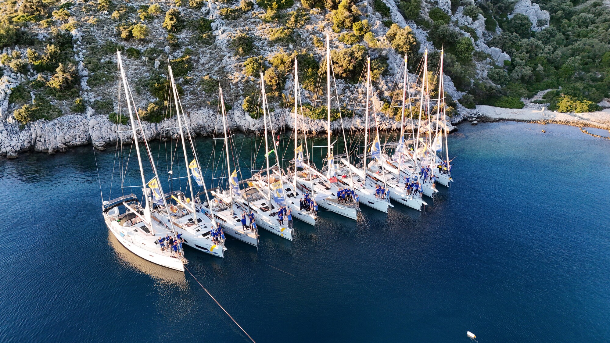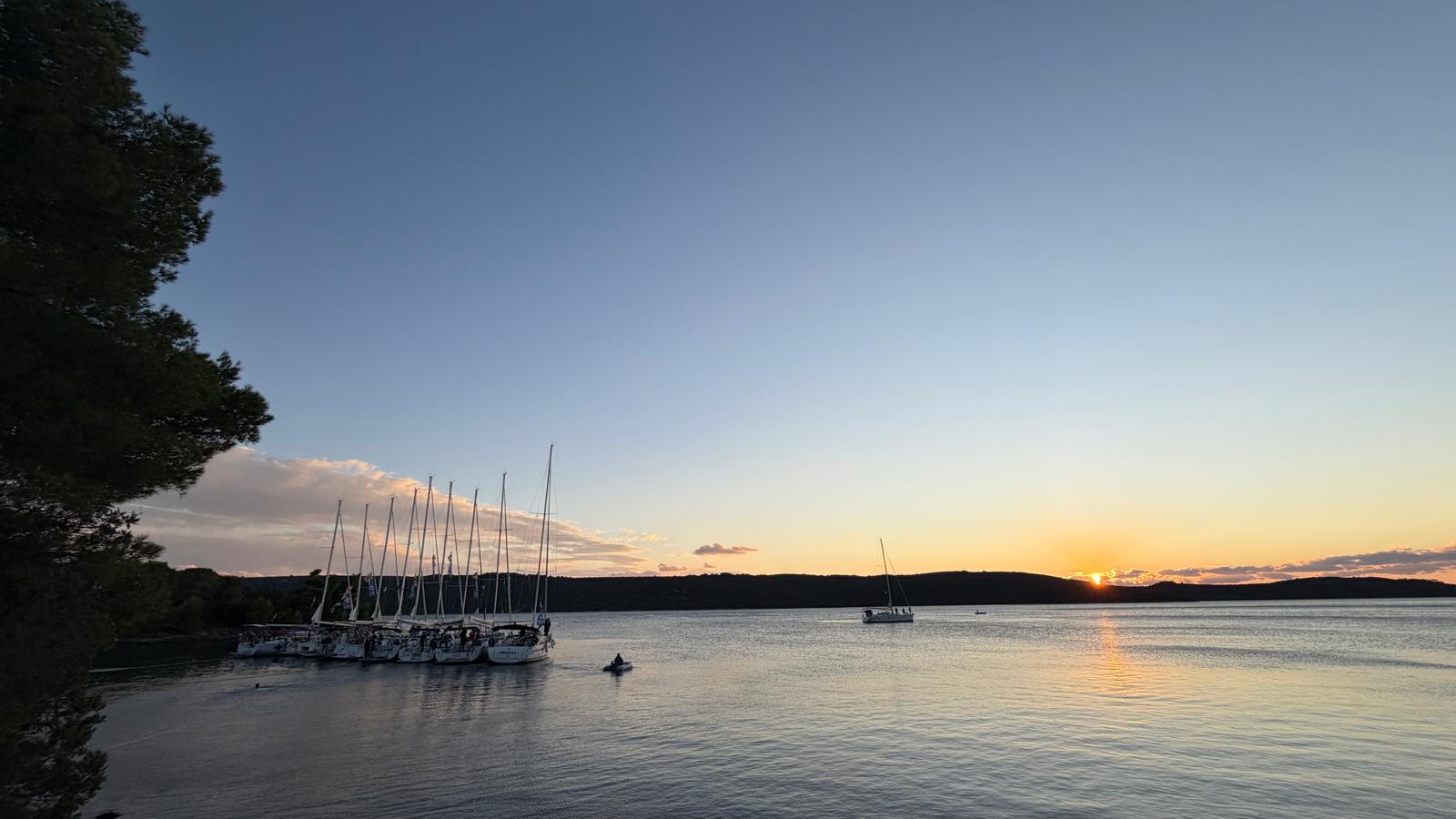 Ziel des Tages war die Marina Veli Iz, eine kleine, aber feine Marina, in der wir gemütlich alle beisammen am Steg rund um das – beziehungsweise im – Kranbecken lagen. Den Abschluss des Abends bildete die Flaggenparade: Jede Crew präsentierte ihre individuell gestaltete Flagge, die den jeweiligen Bootsnamen kreativ widerspiegeln sollte. Aus dieser Präsentation entstand eine kleine Vernissage, bei der die zwischen Werftkran und Laterne aufgehängten Flaggen betrachtet und diskutiert wurden. Die Vielfalt der Designs und die Geschichten dahinter machten diese Ausstellung zu einer besonders gelungenen Abwechslung und zu einem echten Highlight des Tages.