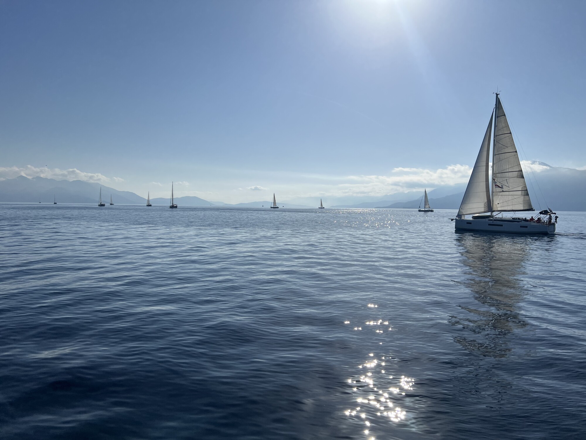 Am Montag sollte die erste Regatta stattfinden. Aufgrund mangelnden Windes musste die Strecke jedoch deutlich verkürzt und einige Zeit zum Start motort werden. Beim Start vor Aghios Gergios war trotzdem noch sehr leichter und wechselnder Wind. Damit konnte ein ausweichpflichtiges Boot leider nicht richtig umgehen, sodass wir ein Manöver des vorletzten Augenblicks einleiten mussten. Das andere Boot änderte dann doch seinen Kurs aber in dieselbe Richtung wie wir, sodass wir mit geringer Geschwindigkeit aneinander vorbeistreiften. Schäden gab es keine, das andere Boot akzeptierte unseren Protest und fuhr sich frei. Am Abend wurde der Vorfall unter den zwei Skippern mit etwas Bier aufgearbeitet. Den sabotierten Start kompensiert das aber leider nicht. Das mussten wir schon selbst wieder rausfahren, was auf der Kreuz mit auf 15 kn auffrischendem Wind auch gut gelang. Bis zur Luvtonne konnten wir wieder einen Großteil des Felds hinter uns lassen. Auf dem darauffolgenden Downwind Kurs bekamen wir dann eine Kostprobe davon, was sich die nächsten Tage immer wieder wiederholen sollte: gegen Nachmittag dreht der Wind um 180° mit etwa 30 Minuten totaler Flaute dazwischen. Gerade mit Wind von Achtern schiebt sich das ganze Feld wieder zusammen, sodass unser hart erkämpfter Vorsprung dahinschmolz. Das war zwar schlecht für unsere Platzierung, bescherte uns jedoch einen spektakulären Zieleinlauf, bei dem wir mit etwa 20 Booten gleichzeitig bei sehr böigen 15 kn Wind in die Düse westlich von Poros reinkreuzten. Die erste Wettfahrt schlossen wir mit einem soliden 4. Platz in unserer Gruppe ab. Angekommen im Hafen von Poros, genossen wir eine erholsame Dusche im örtlichen Badehaus und ließen den Abend mit Würfelspielen ausklingen.