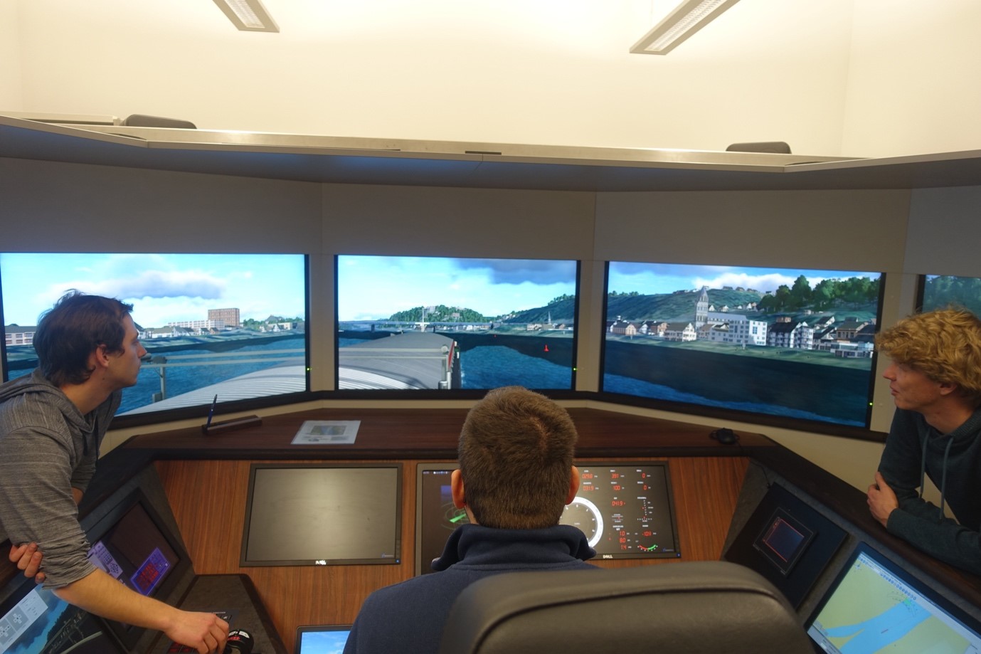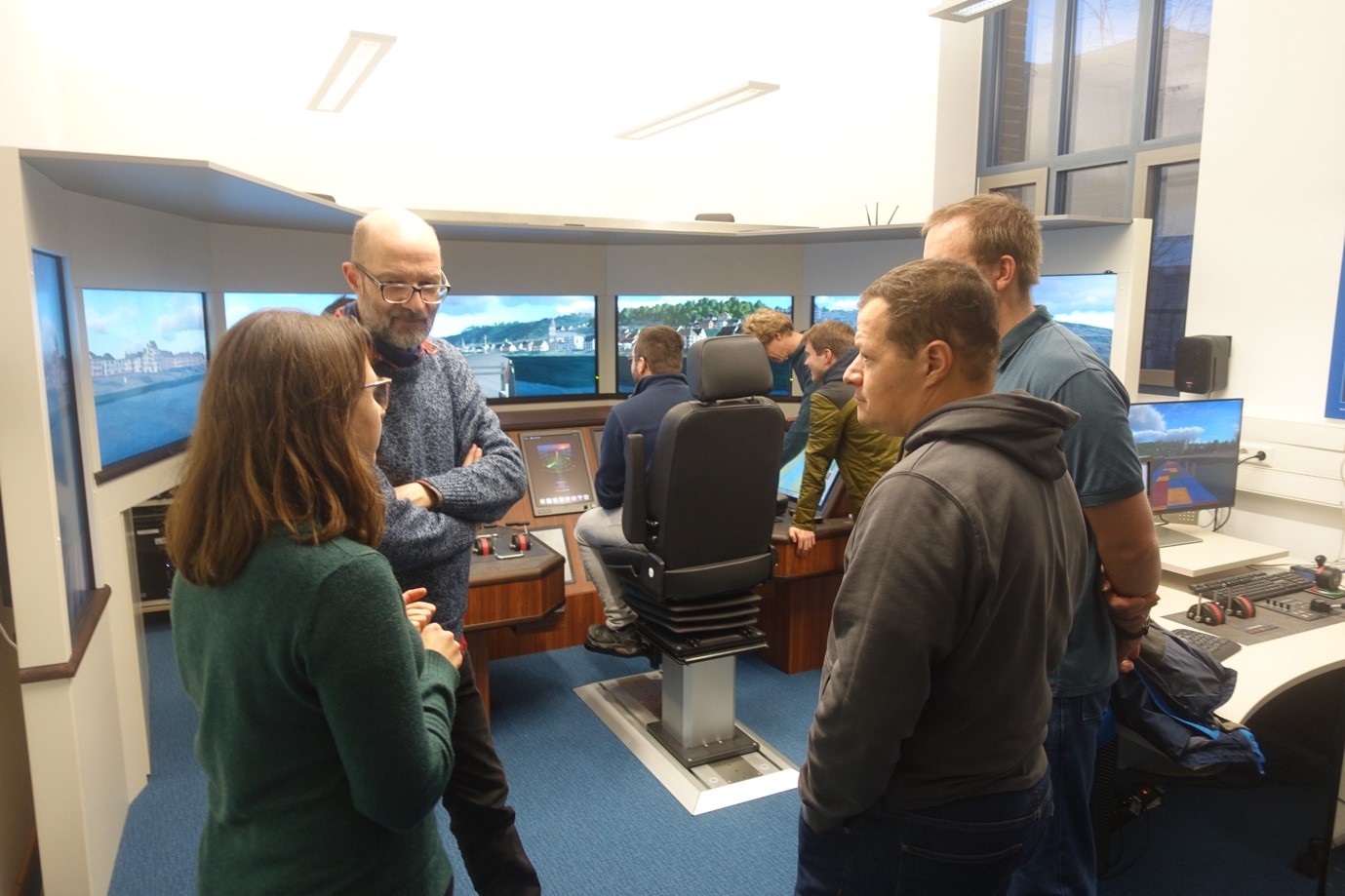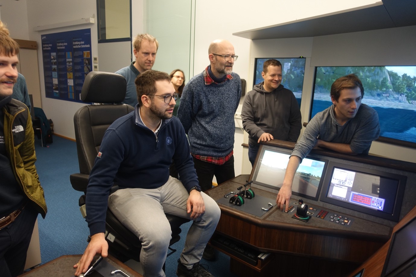 Rebekka und Melissa begrüßen uns bei der BAW. Auf dem Programm stehen eine Testfahrt mit dem Schiffsführungssimulator, sowie eine Führung durch die Experimente in den ausgedehnten Hallen der BAW. Um Gedränge auf der Brücke im Simulator zu vermeiden teilt sich die Gruppe in Crew 1 und 2. Für Crew 1 geht es sofort zum ersehnten Schiffsführungssimulator. Der Rest biegt in den weitverzeigten Hallenkomplex der BAW ab. Während Rebekka in die hohe Kunst der gegenständlichen Modellierung einführt, setzt Melissa unseren Frachter in das virtuelle Wasser vor Koblenz. Die Brücke ist der eines realen Binnenschiffes nach empfunden in alle Richtungen simulieren Bildschirme die Umgebung. Nach einer kurzen Einführung nimmt der erste erfahrene Hochseeskipper auf dem Führerstand Platz. Das Bug schaut in Richtung Karlsruhe und wir blicken auf die Seilbahn zwischen dem deutschen Eck mit Kaiser Wilhem-Denkmal und der Burg Ehrenbreitstein. Der Rhein erscheint wenig attraktiv, so biegen wir in die Mosel ab. Aber schon durch die leichte Kurvenfahrt wird deutlich: So einfach ist das nicht. Auch das potente freidrehbare Bugstrahlruder muss nicht unbedingt eine Hilfe sein, vor allem, wenn es vom 1.ten Offizier nach Gutdünken bedient wird. Wir sparen uns die enge Hafeneinfahrt an Steuerbord für später auf und steuern auf die Balduinbrücke zu. Die ordnungsgemäße Einfahrt zwischen den richtigen Brückenpfeilern gelingt nicht und kurz drauf zerlegen wir Brücke und Boot. Beim Simulator steht der Test der Befahrbarkeit im Vordergrund und nicht der Fehlerfall. Daher gibt es für unseren ersten Versuch auch keinen wirklichen Schadensbericht.